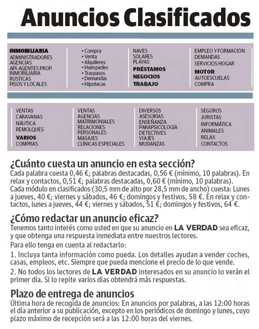 Importes anuncios por palabras: (mínimo 10 palabras) Formato Normal 0,46 € por palabra Formato Destacado 0,56 € por palabra
